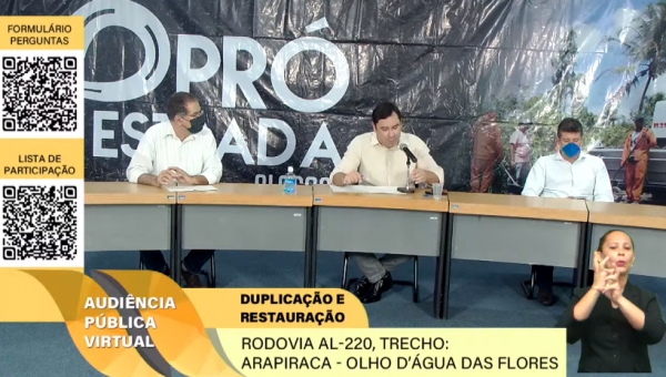 A primeira audiência pública virtual do Estado, que aconteceu na quinta-feira (18), organizada pelo Instituto do Meio Ambiente do Estado de Alagoas (IMA/AL), apresentou o Estudo de Impacto Ambiental e o Relatório de Impacto Ambiental (EIA/RIMA) das obras para a duplicação da rodovia AL-220, trecho que liga Arapiraca e Olho d’Água das Flores. O momento faz parte dos procedimentos do processo de licenciamento ambiental.