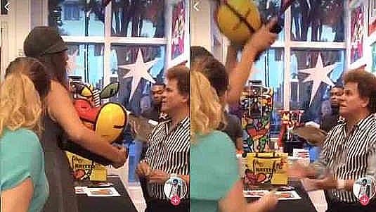 A mulher, que quebrou a obra avaliada em US$ 4.800 (cerca de R$ 25,9 mil) afirma nos vídeos que é dona de um restaurante que fica na frente da loja do artista e que era fã dele. “Considerava você um homem respeitável, mas me equivoquei”, disse ela a Britto em uma galeria dele, em Miami, nos EUA.