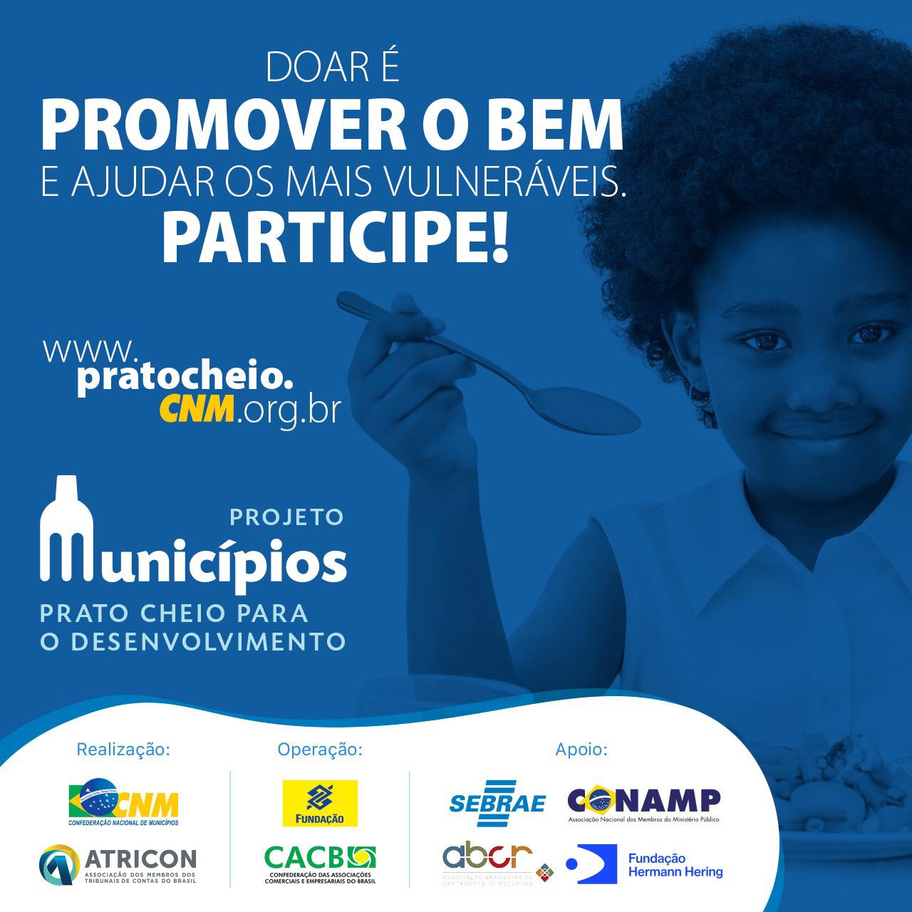 A Confederação Nacional de Municípios (CNM) e seus parceiros lembram que a iniciativa do projeto Município Prato Cheio para o Desenvolvimento levará itens de alimentação, limpeza e higiene à população carente em Municípios com menos de 50 mil habitantes e Índice de Desenvolvimento Humano (IDH) baixo. A expectativa é que ao todo sejam atendidos 3.399 Municípios e cerca de 1,3 milhão de famílias. O objetivo do projeto é amenizar os impactos sociais causados pela pandemia do coronavírus (Covid-19).