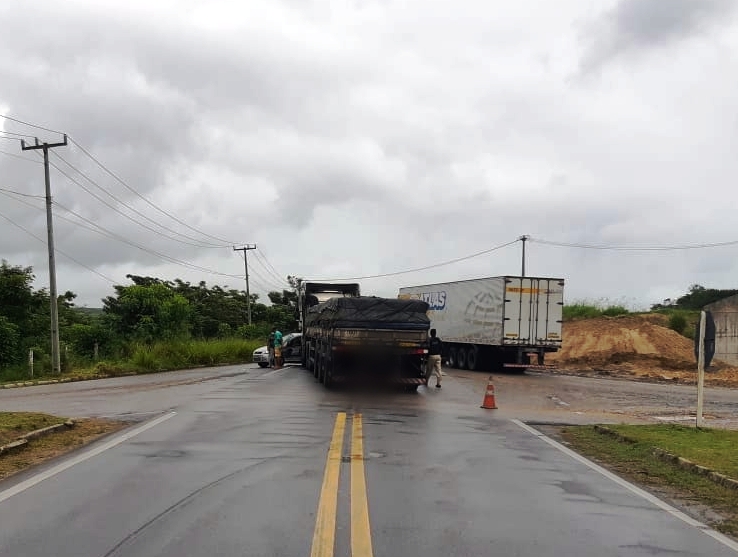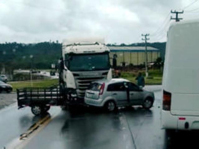 Uma carreta com carga de pós de pedras, proveniente de Americana-SP, colidiu com um Fiesta, modelo hatch, no trevo da Usina Caeté, em São Miguel dos Campos, km 133 da BR-101. De acordo com as informações passadas pela assessoria da Polícia Rodoviária Federal, o veículo de passeio teria cruzado a pista e a carreta colidiu na lateral.