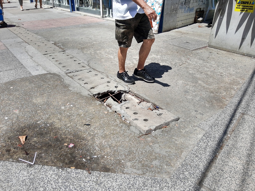 Tampas de valetas estão quebradas em vários pontos do Centro; consumidores relatam acidentes com mulheres e idosos