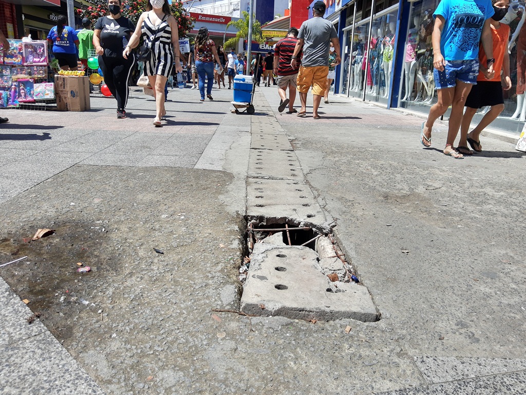 Quem anda pelo comércio de Maceió não demora a encontrar, em algum ponto do calçadão, buracos que põem em risco os pedestres mais desavisados. Isso porque, várias tampas de concreto, das valetas que escoam a água da chuva, estão quebradas. Os buracos são grandes e acabam se tornando armadilhas .