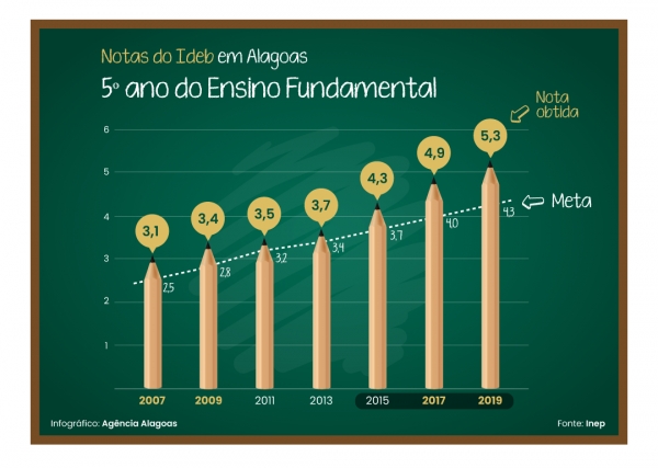 Nos anos iniciais do Ensino Fundamental, Alagoas alcançou a marca de 5,3 pontos, ultrapassando a meta de 4,3 estipulada para 2019. Para os anos finais do Ensino Fundamental, o estado atingiu 4,5 pontos, sendo a meta estipulada pelo MEC de 4,1.