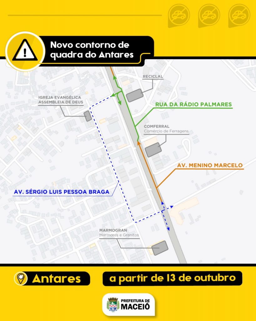 Com implementação do novo contorno de quadra, o condutor que vier pelo sentido Serraria – Antares da Avenida Menino Marcelo e quiser acessar as ruas próximas à Igreja Evangélica Assembleia de Deus deverá entrar à direita na pista paralela à Comferral e seguir pela Rua da Rádio Palmares até a Reciclal. Quando estive neste trecho, o motorista poderá cruzar a Via Expressa e acessar a Avenida Ralpho Pessoa Braga ou retornar à Avenida Menino Marcelo para prosseguir com a sua viagem normalmente.
