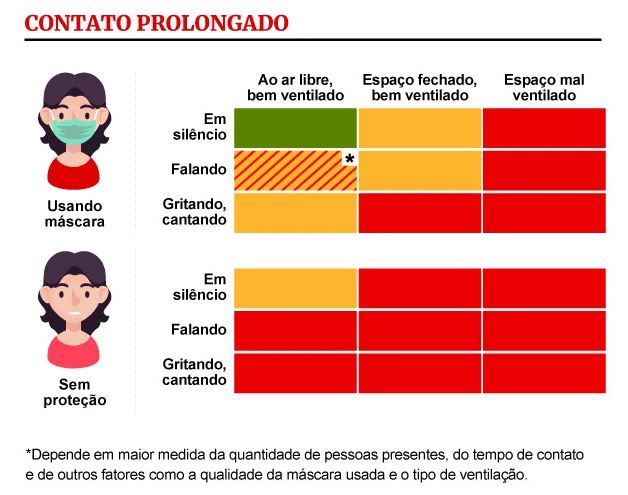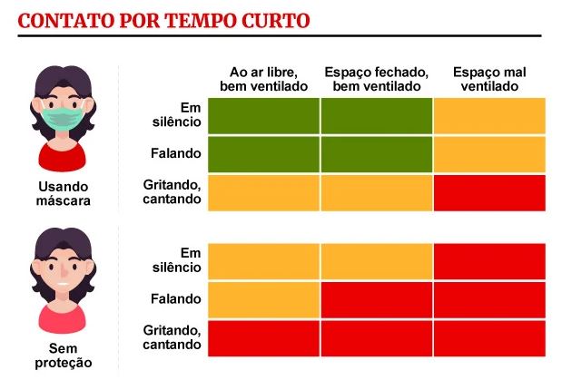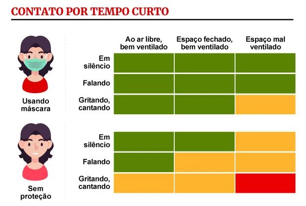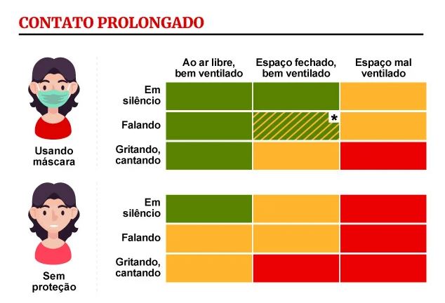 É certo que ambientes fechados e com pouca ventilação são mais perigosos. E também que quanto mais gente presente, maior é o risco de infecção. A atividade desempenhada é outra variável importante, se as pessoas estiverem gritando é mais difícil garantir que uma gotícula contaminada não alcançará você.