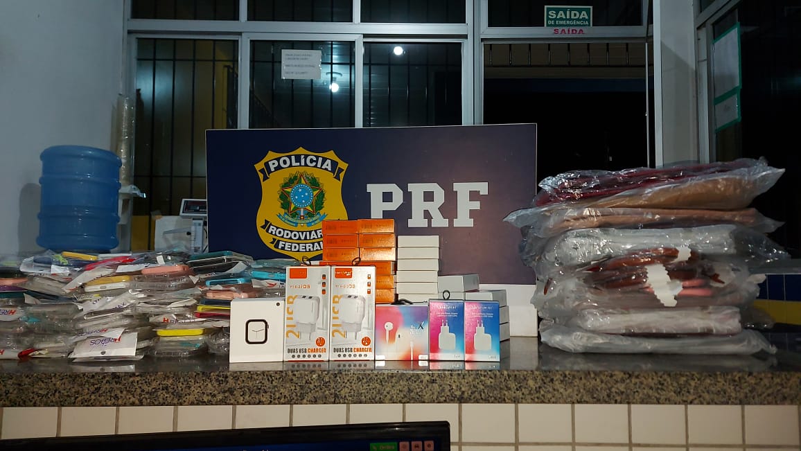 Durante a abordagem, após a verificação da documentação pessoal e do veículo, os policiais fizeram uma vistoria no interior do carro, encontrando 404 mercadorias sem notas fiscais, sendo: 130 itens diversos de vestuário, 210 capas de celulares de vários modelos; 20 carregadores duplos; 05 relógios de marca não identificada; 10 fones para celular Iphone; 09 carregadores simples de marcas não identificados; 20 fones para celular Samsung J5.