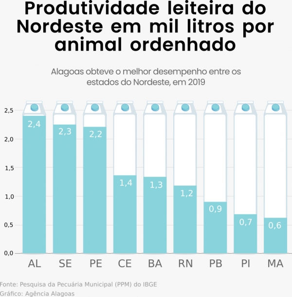 Com um rebanho de 250,5 mil vacas ordenhadas, Alagoas produziu um total de 603,8 milhões de litros de leite em 2019. Isso representa 2.410 litros por animal, fazendo com que o estado tenha a maior produtividade leiteira do Nordeste.