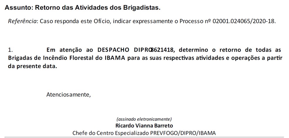 O Ibama determinou, em ofício nesta sexta-feira (23), que as brigadas de incêndios florestais “retornem para as suas respectivas atividades e operações a partir da presente data”. O ofício é assinado pelo chefe do Centro Especializado Prevfogo/Dipro, Ricardo Vianna Barreto. A determinação foi expedida após liberação de recursos para o órgão.