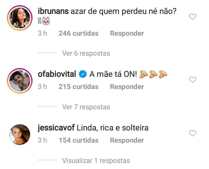 Uma fã comentou “Azar de quem perdeu, né não?” e teve seu comentário curtido pela estilista. Jade ainda deu like em outras publicações de fãs, como “DONA DO MUNDO, sorte de quem não te deixa escapar”, “a mãe ta ON!” e “Linda, rica e solteira”.