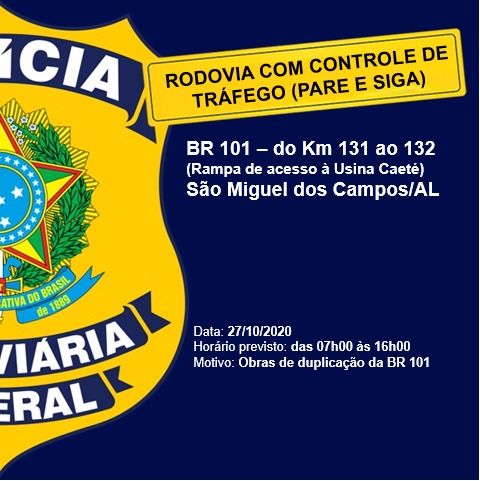 As equipes da Polícia Rodoviária Federal irão realizar até às 16h desta terça-feira, 27, o controle de tráfego entre os quilômetros 131 e 132 da BR-101, rampa de acesso à Usina Caeté.