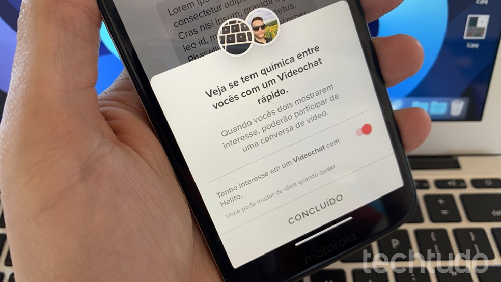 Passo 1. Acesse a aba de mensagens do Tinder e abra a conversa com a pessoa que você quer fazer uma chamada de vídeo. Em seguida, pressione o ícone da câmera, no canto superior direito da tela. Ative a opção indicada e toque em “Concluído”. Note que a outra parte deve fazer o mesmo para que o recurso seja habilitado;