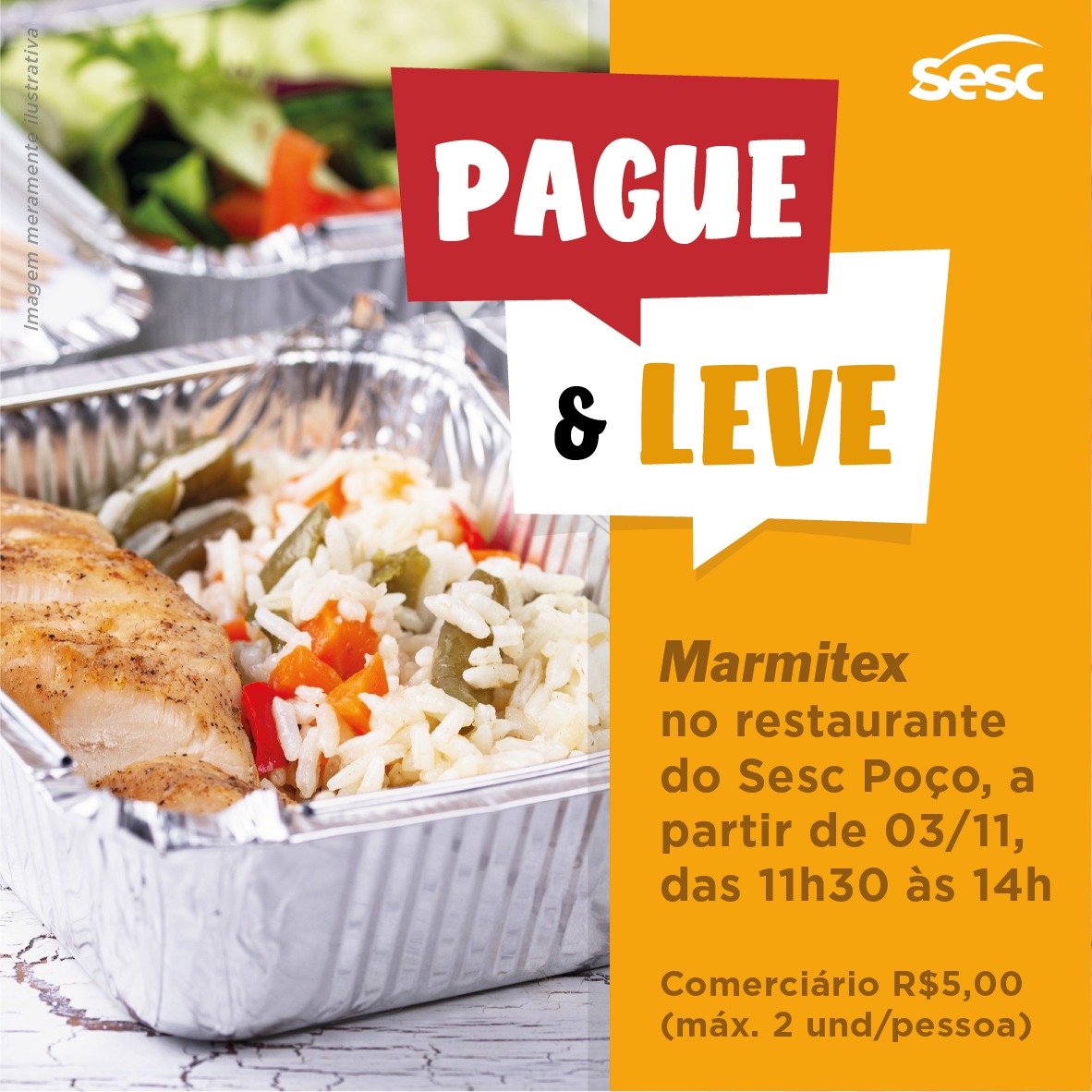 O restaurante do Sesc, da Unidade Poço, voltará a funcionar na modalidade “Pague & Leve”, a partir do dia 03.11, das 11h30 às 14h. A marmitex será vendida ao preço de R$ 5 apenas para o trabalhador do comércio de bens, serviços e turismo, mediante a apresentação do Cartão Sesc. A compra será limitada a duas unidades por pessoa. Vale ressaltar que para pegar o alimento será possível somente com o uso da máscara.