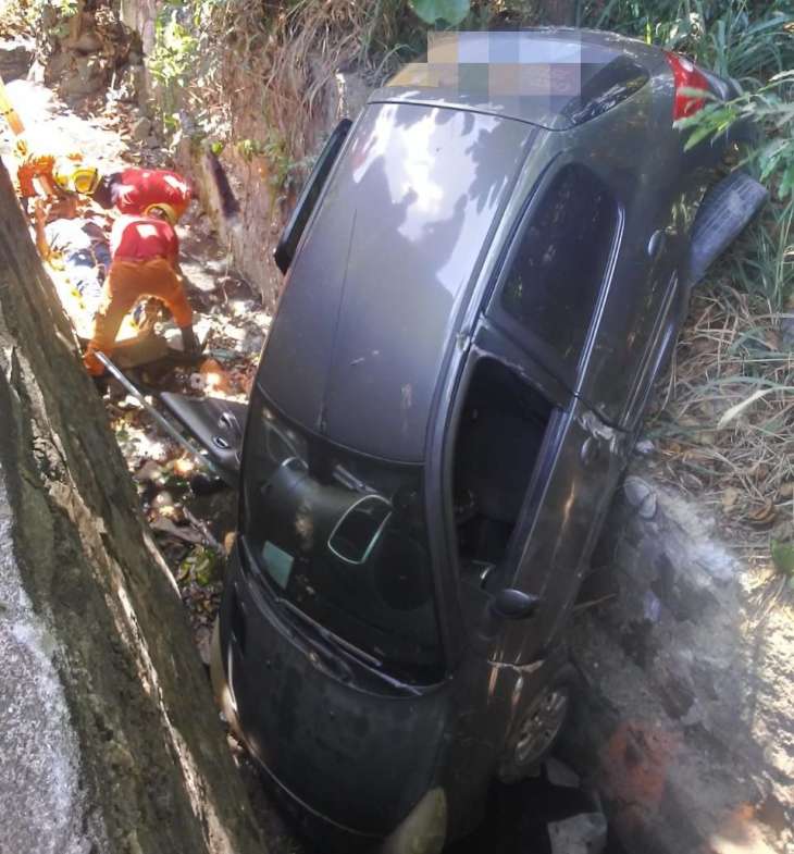 Fato semelhante ao registrado não tarde de quinta-feira, 29, quando o motorista ficou com o veículo suspenso no mesmo córrego que fica paralelo a via.