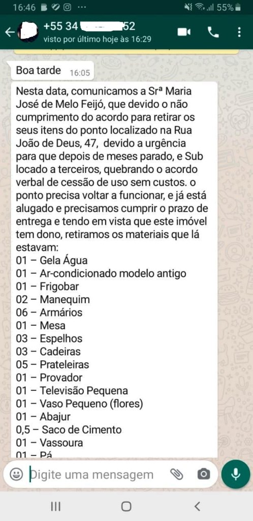 Com o prazo de quatro horas que foi dado para a saída do imóvel, Sandra ficou assustada. “Fui no Fórum. Lá só tinha a Defensoria Pública. Falei com o defensor e falou para mim que eu não sairia senão fosse por um mandado judicial. Aí eu mandei dizer isso para ela. Só que antes eu perguntei onde ela estava (Dona Pauline). Ele [Eliakim] disse que ela estava em casa [em Junqueiro]. Eu disse que iria falar com ela. Em 10 minutos ele voltou e disse que ela só queria a chave. Ela disse que não me receberia. Ela deixou claro que ela pode e que está além da lei. Disse ao advogado dela que não me reuniria mais por que ficou claro que eu era lixo perto dela. Aí pelo fato de eu ter dito que seria só na Justiça, ela arrombou pela primeira vez, né? Tirou parte de minhas coisas, levou para a terraplanagem, que é uma garagem deles e comunicou através de Whatsapp”. Sandra relata que a mensagem foi de uma mulher identificada como Priscila (que trabalharia para os Pereira), inventariando o que havia na loja e orientando que ela desocupasse o imóvel, pois segundo a mensagem, o imóvel já estava alugado para outra pessoa.