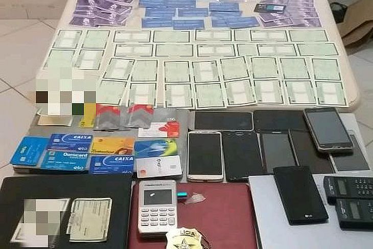 Com os presos foram aprendidos notbooks, celulares, cartões de créditos, documentos falsificados, cédulas de identidade em branco, vários papéis com dados de pessoas, vários chips de celular e dois veículos.