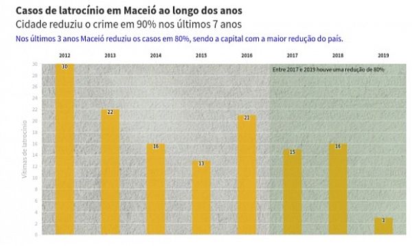 A queda no número de latrocínios na capital alagoana é ainda maior quando analisados os dados de 2012 a 2019. Neste período a capital registrou uma redução de 90%, saindo de 30 casos para apenas 3. Alagoas também apresentou uma queda expressiva, já que em 2012 registrou 96 casos de latrocínio, mas em 2019 teve apenas 18 em todo o estado, representando uma redução de 81,25%.