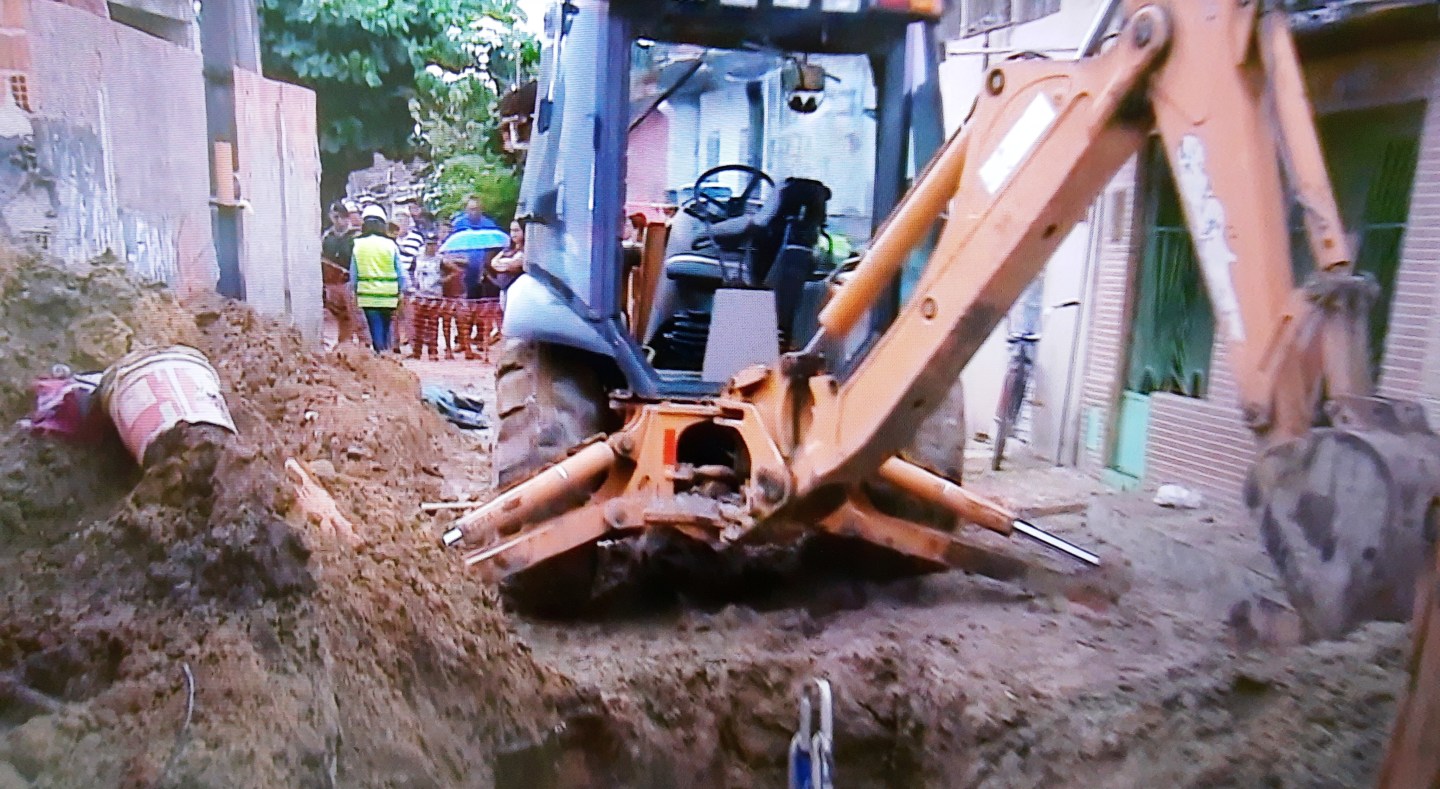 A rua onde a obra está sendo realizada, por uma empresa contratada pela Prefeitura, é estreita e o buraco aberto para colocação dos tubos beira as casas.