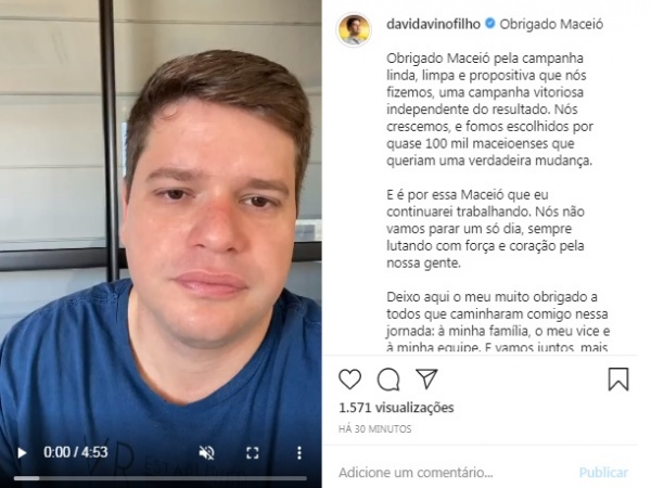 O deputado estadual Davi Davino Filho, do partido Progressistas, que concorreu à vaga de prefeito em Maceió, usou as redes sociais para agradecer aos mais de 97 mil votos que recebeu no primeiro turno das eleições. O agradecimento foi feito através de uma live na manhã de hoje (16), onde Davi pediu aos candidatos JHC e Alfredo Gaspar, um segundo turno limpo e propositivo.