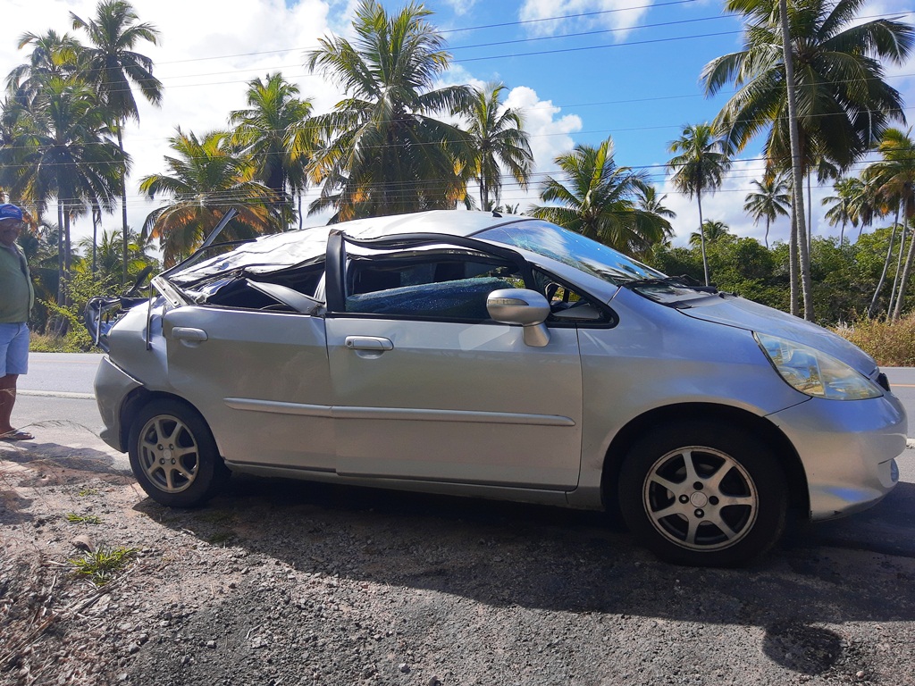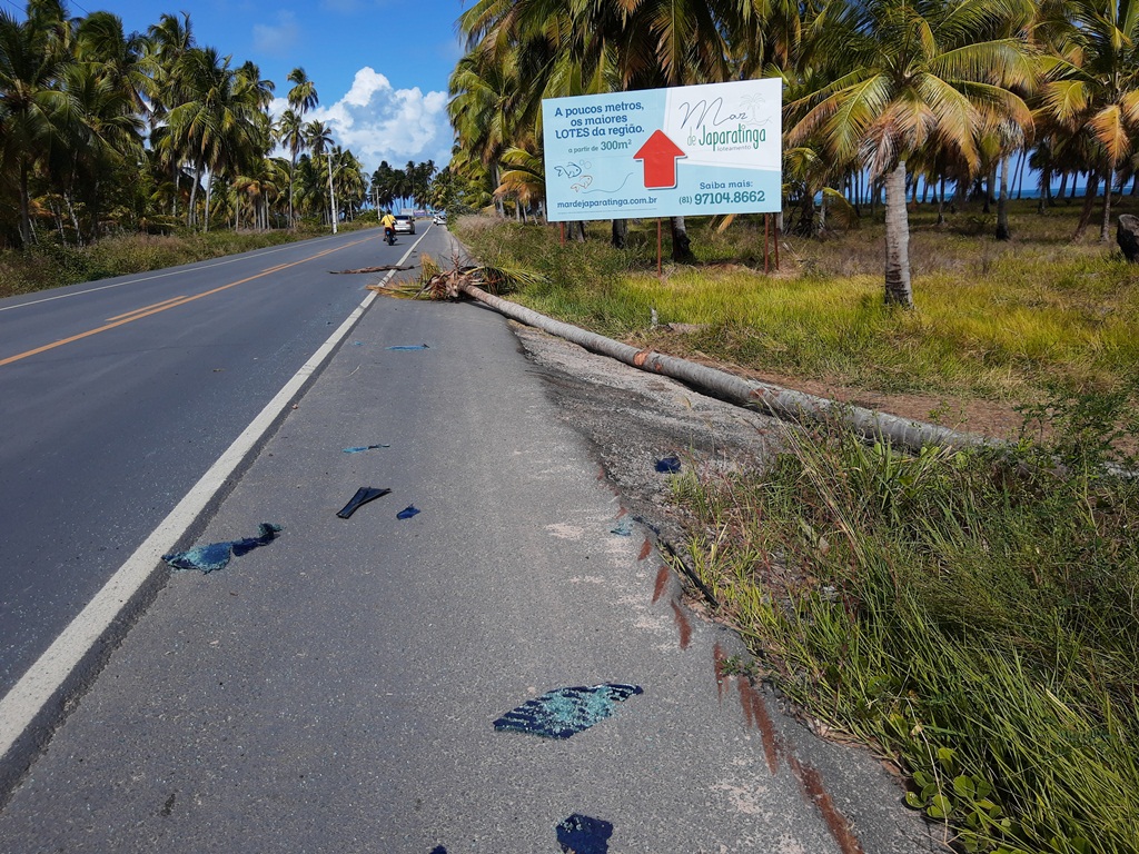 Por pouco um coqueiro não causa uma tragédia, no início da tarde desta terça-feira (24), na AL 465, logo após a entrada de Japaratinga, no Litoral Norte de Alagoas. Com a raiz podre, a planta não aguentou o peso do tronco e caiu na margem da pista atingindo o lado direito de um Honda Fit que passava na hora.