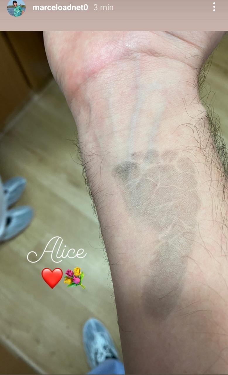 Logo após o parto, o papai orgulhoso não perdeu tempo em postar foto nos stories do Instagram com a marca do pezinho da filha no braço. Sobre um coração, Adnet escreveu: “Alice”