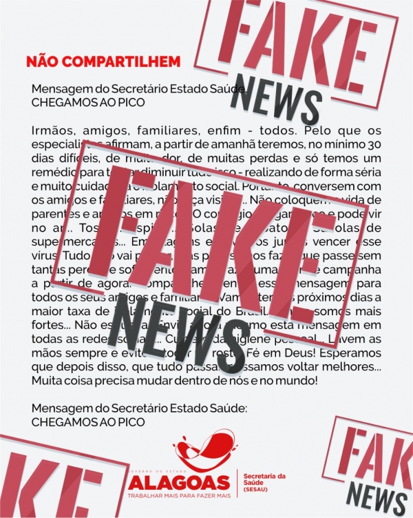A mensagem intitulada como “Chegamos ao Pico” faz uma alusão a um suposto ápice no número de infecções pela doença em Alagoas. “Nunca concedi uma entrevista ou falei sobre este assunto dessa forma. Todo o conteúdo que levamos ao conhecimento da população tem, prioritariamente, base na ciência e nas decisões que o Governo de Alagoas toma no contínuo enfrentamento à pandemia da Covid-19. Portanto, a mensagem que vem sendo distribuída é falsa”, destacou o secretário Alexandre Ayres.