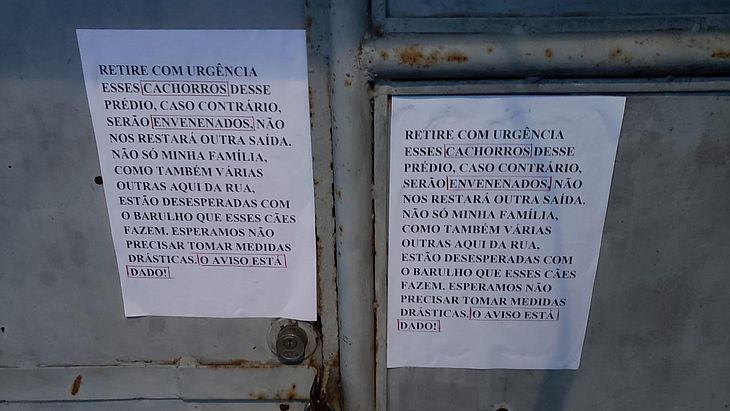 “Retirem com urgência esses cachorros desse prédio. Caso contrário, serão envenenados, não nos restará outra saída. Não só minha família, como também várias outras aqui da rua, estão desesperadas com o barulho que esses cães fazem. Esperamos não tomar medidas drásticas. O aviso está dado”, diz a ameaça escrita nos cartazes.