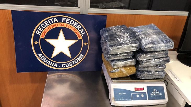 O entorpecente foi localizado pela equipe de Repressão e Combate ao Contrabando e ao Descaminho, da Receita Federal, durante procedimento de fiscalização de bagagens dos viajantes.