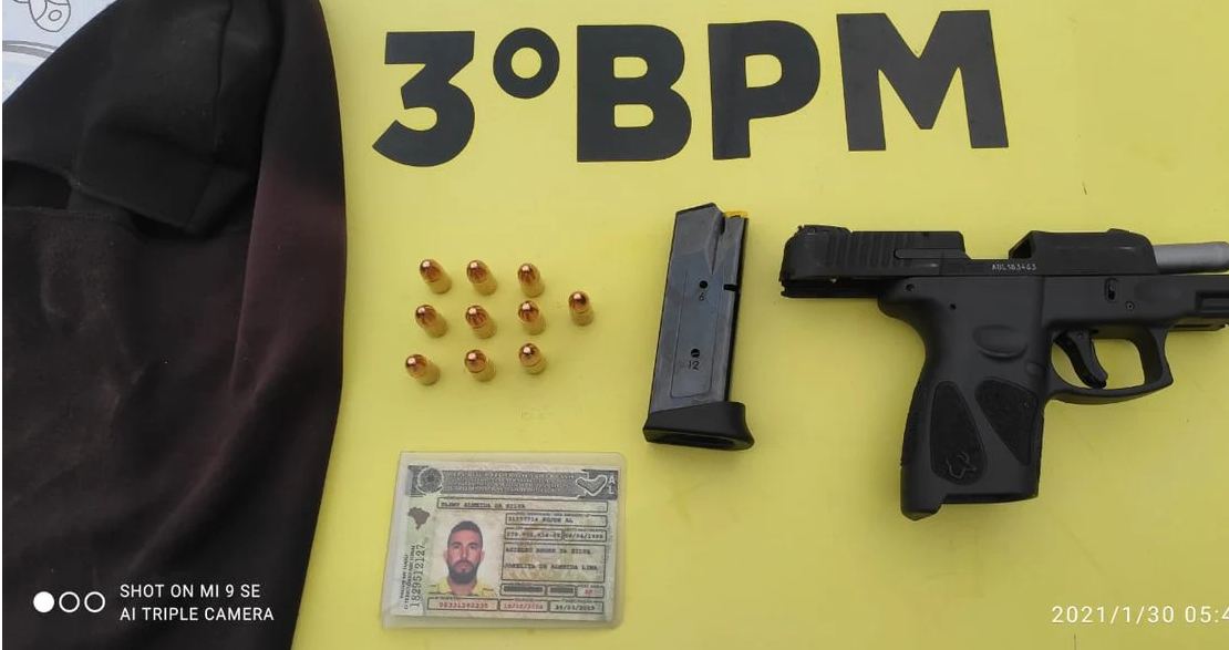 Após a ação ele foi abordado e durante a revista pessoal foi encontrada uma arma de fogo 9MM, um carregador, 10 munições do mesmo calibre, uma balaclava e R $114,00 em espécie.