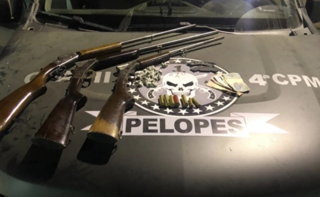 Os militares chegaram ao local após receberem um informe de que havia indivíduos armados na região. Com a aproximação das equipes, alguns indivíduos empreenderam fuga abandonando alguns objetos e seguindo destinos diferentes, no entanto, dois deles foram interceptados. Durante a busca pessoal, foi verificado que a dupla estava com 40 bombinhas de maconha e R$ 33,00. Após busca no perímetro onde os infratores estavam, os policiais apreenderam as armas, sendo uma de calibre 32, outra de calibre 28 e a terceira de calibre 9.1. Também foram encontradas sete munições.