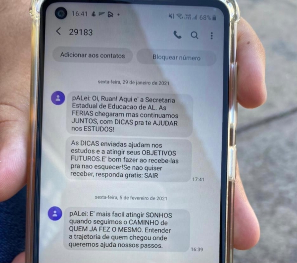 Visando manter a rotina regular de estudos e reforçar a comunicação entre unidade de ensino e comunidade escolar nestes tempos de Pandemia e isolamento social, a Secretaria de Estado da Educação (Seduc), com o apoio do Instituto Sonho Grande, criou o projeto SMS e Call Center, que beneficia mais de 8 mil famílias com estudantes matriculados na rede estadual. Esta é mais uma ação de busca ativa, que visa fortalecer ainda mais as ações do Programa Alagoano de Ensino Integral – pALei.