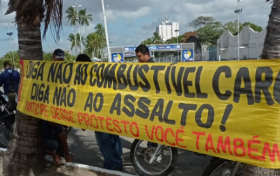 Com faixas com a frase “Diga não ao combustível caro, diga não ao assalto”, os manifestantes cobram uma solução para evitar o crescimento no valor do combustível nos postos da cidade.