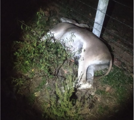 Sem tempo para desviar, o veículo se chocou com o animal e o arremessou para fora da rodovia. O jumento parou próximo a uma cerca com arame.