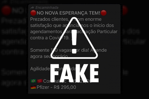 Amplamente compartilhada em grupos de WhatsApp, a mensagem fake diz: “Prezados clientes, é com enorme satisfação que anunciamos o início dos agendamentos para vacinação particular contra a Covid-19. Somente 110 vagas por dia! Agende agora seu horário”.