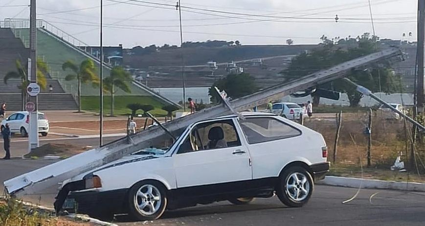 Com a força do impacto, o poste caiu sobre o veículo. Felizmente, os danos foram apenas materiais.