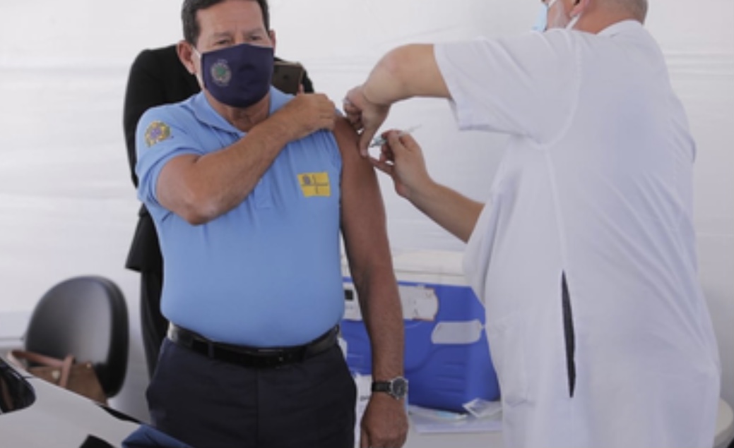 O vice-presidente Hamilton Mourão tomou hoje (29) a primeira dose da vacina CoronaVac contra covid-19, em Brasília. A CoronaVac é produzida no Brasil pelo Instituto Butantan, em parceria com o laboratório chinês Sinovac, e administrada em duas doses, com intervalo de até quatro semanas.