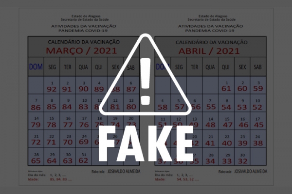 Circula no WhatsApp um suposto calendário oficial com diversas datas para a vacinação contra a Covid-19 em Alagoas. O conteúdo é falso. As informações não foram divulgadas pela Secretaria de Estado da Saúde (Sesau). A pasta informou que a vacinação depende do envio de doses pelo Ministério da Saúde e da quantidade de pessoas em cada faixa etária.