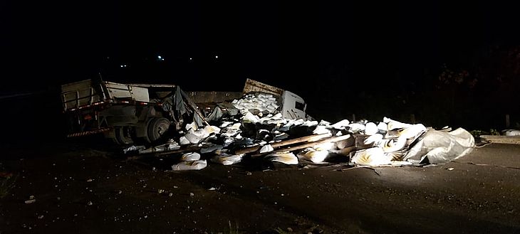 Com o tombamento, toda a carga caiu e ficou espalhada na via.
