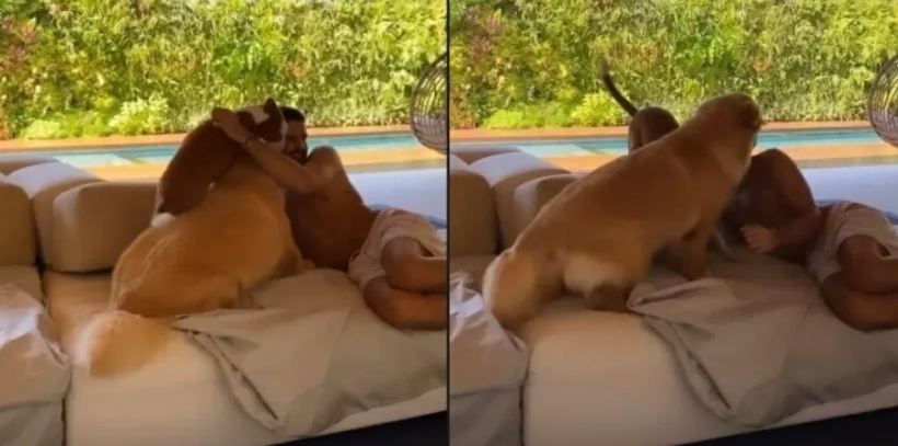 A atriz filmou o namorado interagindo com dois cães, à vontade em um sofá. Além disso, a piscina da casa e a risada de Bruna também chamam atenção.